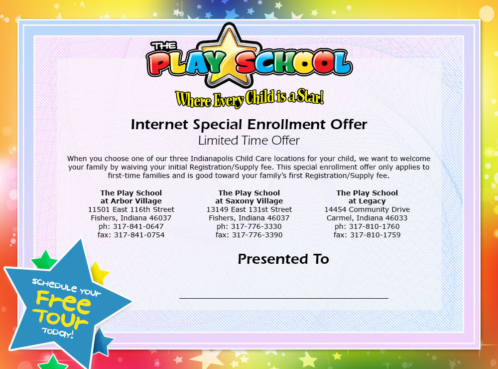 Are you ready to enroll a child at The Play School? Print the below offer details and submit it along with the enrollment paperwork provided by the director at your selected Indianapolis child care location.